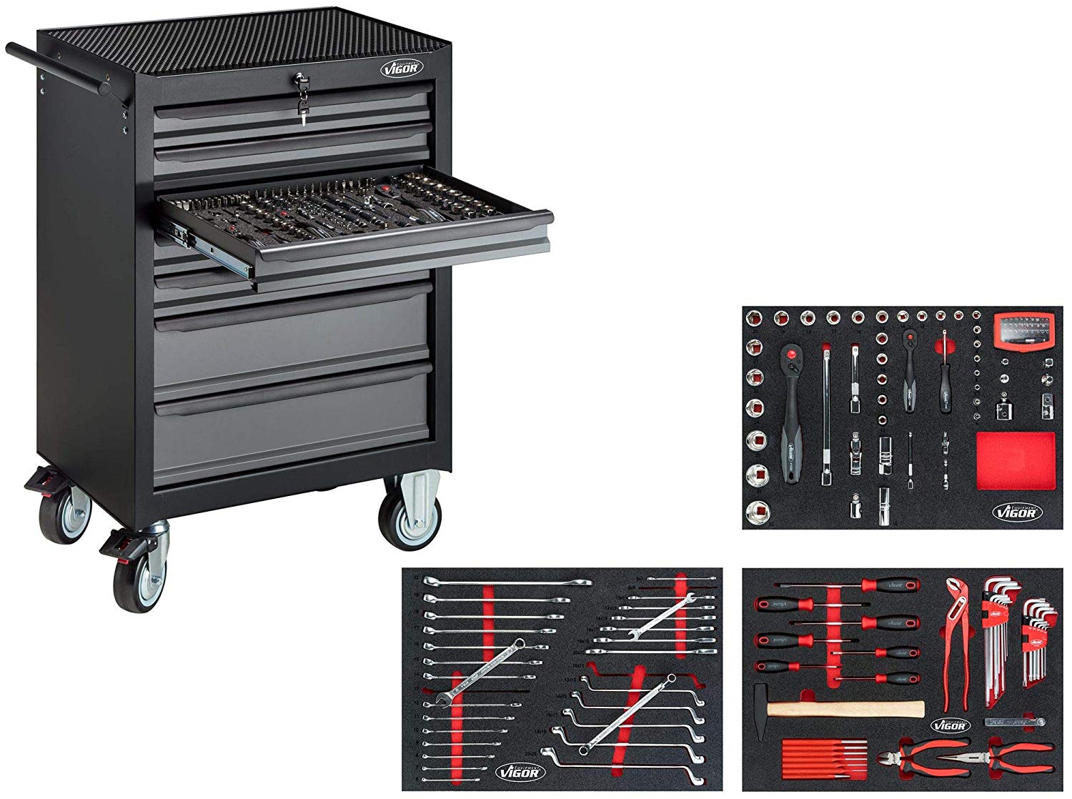 Vigor verkfæravagn með 7 skúffum ásamt 164 verkfærum